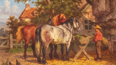 Het verzorgen van de paarden. Paneel: 19 x 26 cm, gesigneerd